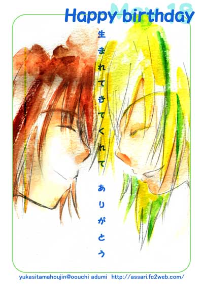 おおうちさまからの頂きモノですvというより、強奪品(笑) 今ごろになってupになったのは・・・・・・単純に上げ忘れてたんです(苦笑) どうもありがとうございましたー!そして水彩イラスト・・・きれーvv