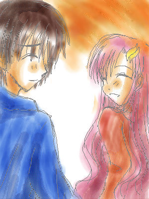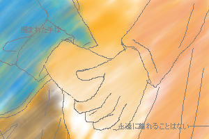 *掴んだ手* 『あ』 ラクス、何か思いついたらしいです。 さてこの手は誰でしょう?(聞かなくてもわかるちゅ―の) ちょっと楽しげです、ラクス。何をする気でしょうか。 『?』 ラクスの笑みに思わず顔をしかめるキラ。 「あ」 ラクス、手握っちゃいました。 「キラ、行きましょう」 「うん」 少し照れた顔をしながら、伝わるぬくもりが心地良く。 掴まれた手は熱を帯びたように熱い。 それは。 きっと互いの体温が上昇しているからだと思いたい――――。